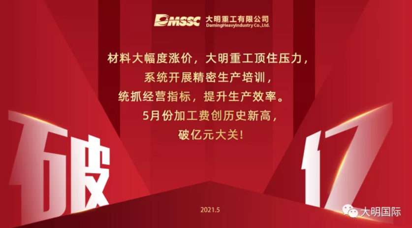 繼2020年5月份加工費突破8000萬元后,在材料大幅度漲價等不利因素下,大明重工頂住壓力,開展精益生產系統培訓,優化經營管理,統抓經營指標,提高生產效率。在全體員工的齊心協力、踏實拼搏下,5月份加工費創下了歷史新高,突破1億元大關,達到10033萬元,實現紅五月,月度同比增長21%,為實現2021年奮斗目標奠定了堅實的基礎。
